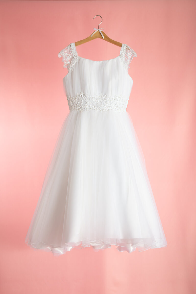 Abito da comunione di alta qualità in toulle manoseta, con corpino e gonna arricciati, trattenuti in vita da un bordo in pizzo prezioso e ricamato. Le spalline sono coordinate e ricamate.