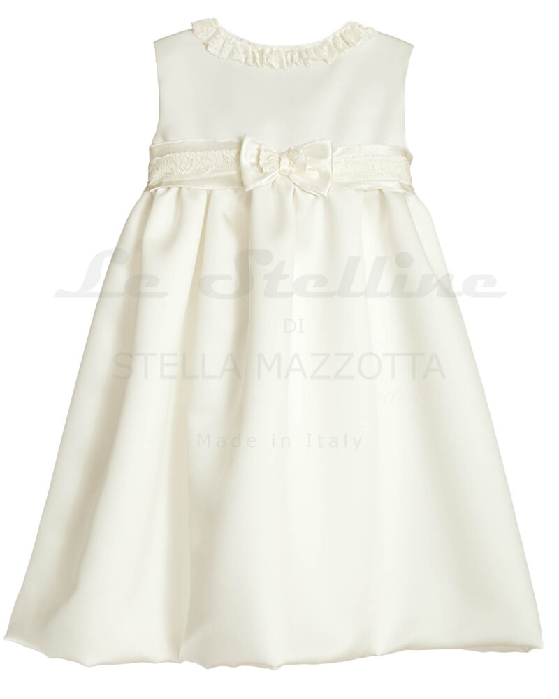 100% made in Italy. Tessuto in raso bianco seta, con corpino impreziosito da una cinta raffinata in raso con fiocco e rifinitura in merletto. La gonna è arricciata e doppiata con fodera di raso. La fodera è in batista