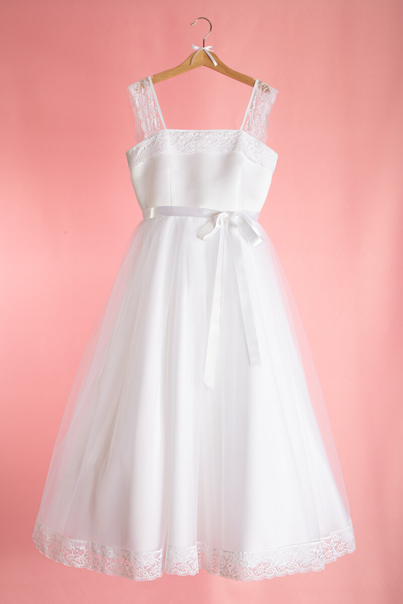 Abito da comunione di alta qualità con gonna longuette in toulle manoseta, leggermente arricciata in vita ed arricchita sull'orlo, da un bordo in pizzo valencienne. Sotto il primo strato di toulle ci sono altri due strati in toulle e due di fodera di raso. La cinta è in raso