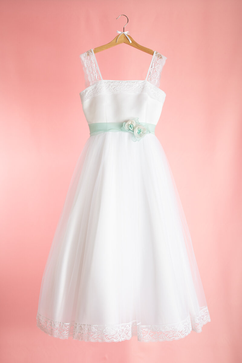 Abito da comunione di alta qualità con gonna longuette in toulle manoseta, leggermente arricciata in vita ed arricchita sull'orlo, da un bordo in pizzo valencienne. Sotto il primo strato di toulle ci sono altri due strati in toulle e due di fodera di raso. La cinta è in organza.