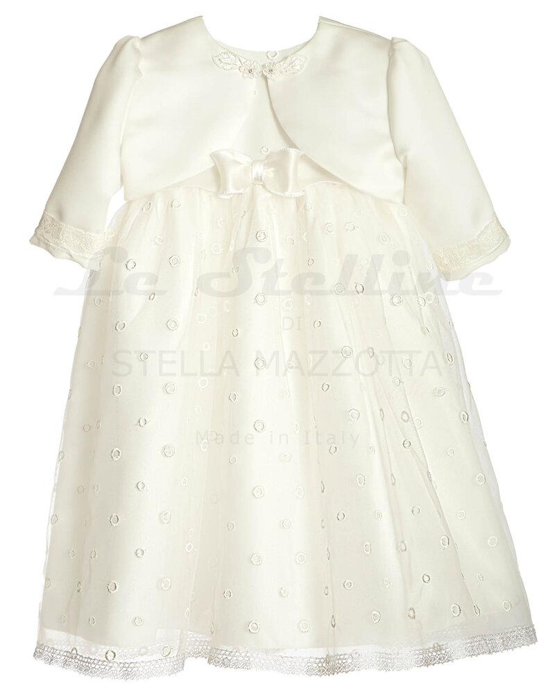 Il giacchino in raso è abbinato ad un abito di alta moda, cucito e ricamato artigianalmente in atelier di abiti da sposa, 100% made in Italy. Tessuto in tulle "mano seta" decorato a pois con un orlino ricamato, arricchito in vita da cintina in raso con un fiocco che trattiene una gonna vaporosa. L'abito è composto da altri due teli semplici di tulle "mano seta" , uno strato di fodera in raso e infine uno strato di batista 100% cotone a contatto con la pelle.