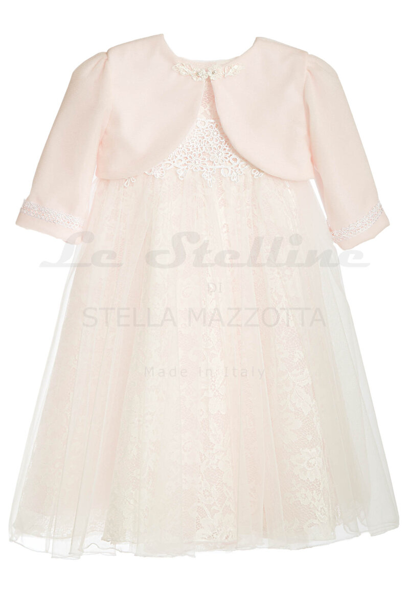 Il giacchino in tulle è abbinato ad un abito di alta moda, anch'esso in tulle, cucito e ricamato artigianalmente in atelier di abiti da sposa, 100% made in Italy. Tessuto in tulle "mano seta" che lascia intravedere un ricco pizzo lavorato su una base rosa di batista 100% cotone. La gonna è arricciata, formata da 3 strati di morbido tulle "mano seta", uno strato di pizzo e due strati di batista rosa100% cotone a contatto della pelle. La cintina, in macramè con fiocco in tulle, da annodare sul retro del vestito. Il modello dell'abito ha le maniche in rouche, formate con il tulle "mano seta", il girocollo e lunghezza alla caviglia. Il giacchino coordinato in tulle marmorizzato è a manica lunga con bordino ricamato sul polso e la bottonatura con gancetto nascosto da un raffinato ricamo. Il retro dell'abito ha la chiusura con zip invisibile.
