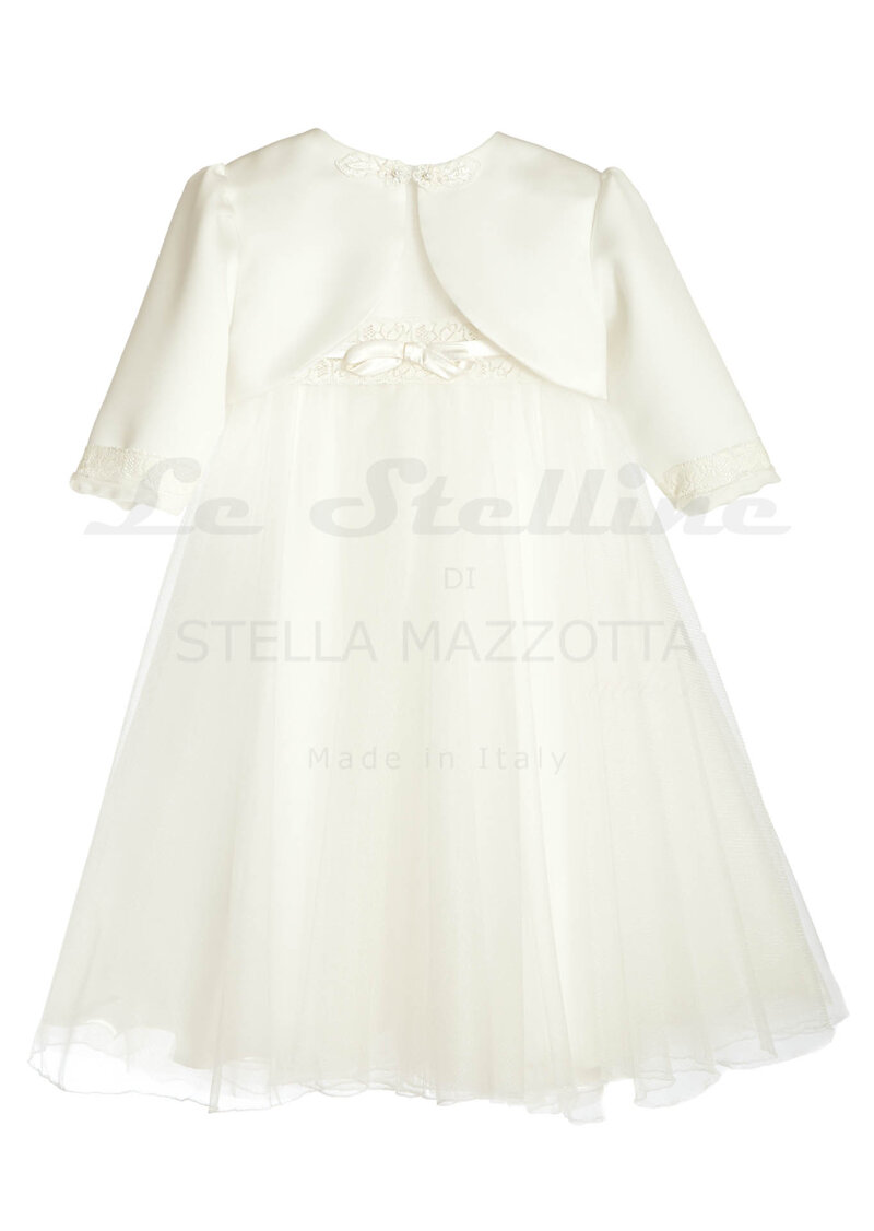 Il giacchino in raso è abbinato ad un abito di alta moda, in tulle, cucito e ricamato artigianalmente in atelier di abiti da sposa, 100% made in Italy. Tessuto in tulle "mano seta" luminoso marmorizzato bianco seta, con corpino arricchito con rouche in tulle. La gonna è arricciata in morbido tulle che si sovrappone a due ulteriori strati di tulle "mano seta" e ad uno strato di fodera di raso. La fodera è in batista 100% cotone a contatto della pelle. La cinta, in pizzo e nastrino di raso con fiocco, da annodare sul retro del vestito. Il modello dell'abito è senza maniche, con girocollo, lunghezza alla caviglia. Il giacchino coordinato in raso è a manica lunga con bordino ricamato sul polso e la bottonatura con gancetto nascosto da un raffinato ricamo. Il retro dell'abito ha la chiusura con zip invisibile .