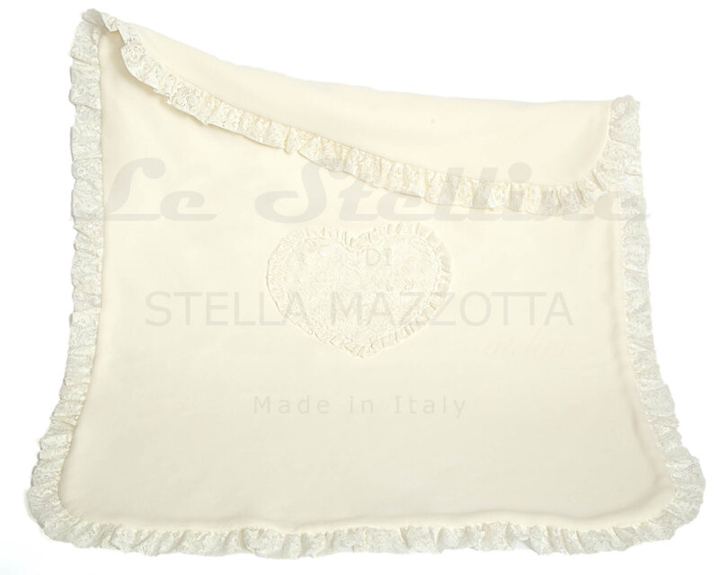 Copertina in tessuto pile bianco seta, realizzata totalmente in Italia presso atelier di abiti da sposa. La coperta è realizzata con doppio strato di tessuto pile che la rende molto calda ed avvolgente. Un elegante rouche di pizzo rifinisce l'orlo ed un particolare disegno di un cuore sulla parte anteriore. La coperta misura 85 cm x 95 cm ed è adatta a passeggino, culla o per avvolgere la neonata. La sua eleganza la rende adatta ad eventi cerimoniali come battesimi, matrimoni e compleanni.