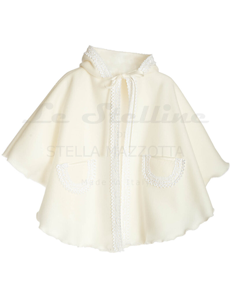 Mantella con cappuccio, realizzata con rifiniture di alta qualità e prodotta interamente in Italia presso atelier di abiti da sposa. Il tessuto utilizzato è morbido pile bianco seta, molto caldo e avvolgente. La mantella è arricchita da un elegante rifinitura in macramè che impreziosisce anche le due taschine anteriori. Si annoda davanti con un nastrino di raso. La mantellina, utile anche per l'uso quotidiano, è particolarmente adatta alle cerimonie, battesimi e matrimoni, che richiedono una certa eleganza senza rinunciare alla praticità ed al comfort del caldo tessuto di pile.